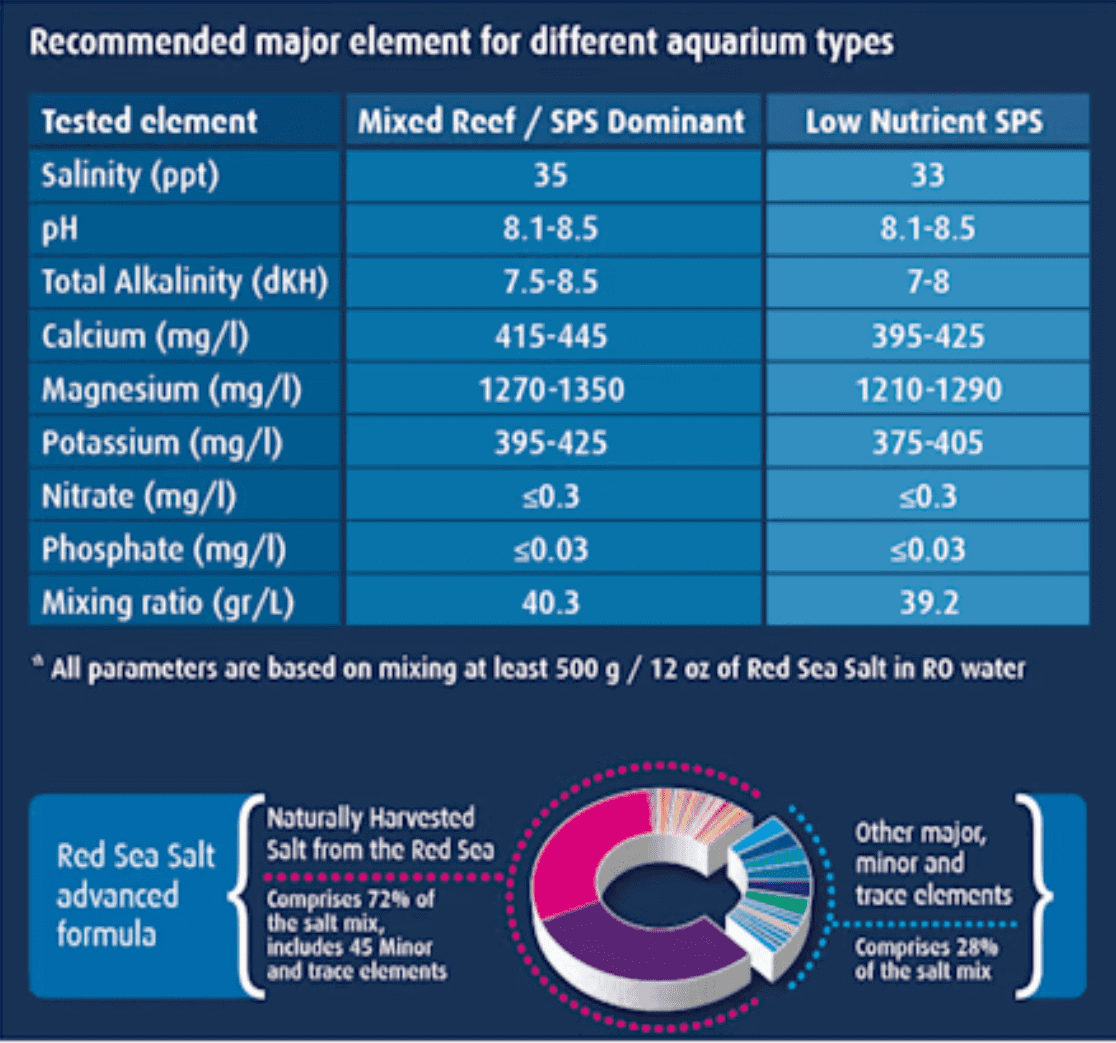 Q: How much salt do I need to reach a salinity of 35ppt (1.026 sg)? A: You will need approximately 38 grams of Red Sea Salt per liter of RO/DI water to reach 35ppt. Always verify with a calibrated refractometer before adding water to your aquarium.